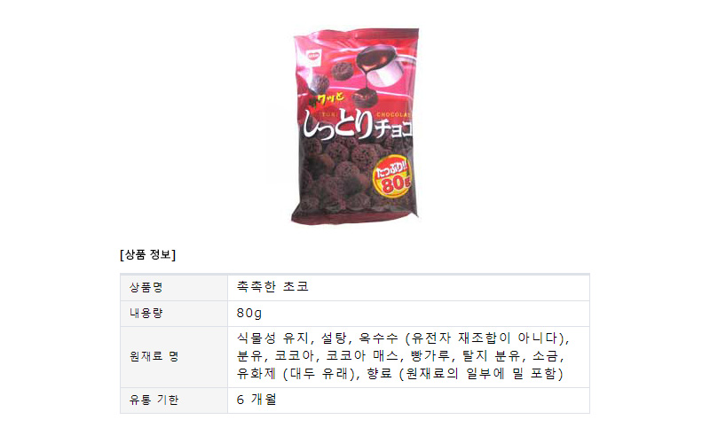 초콜릿: 주된 성분은 밀가루와 초콜릿으로, 고소하고 풍부한 맛을 제공합니다.